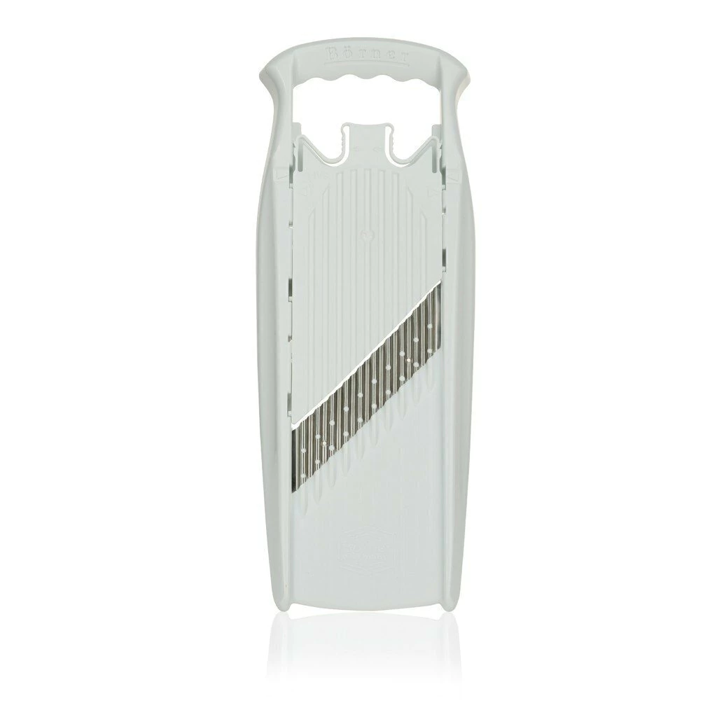 Esta mandolina es ideal para disfrutar de papas fritas, snacks saludables pasa ppara el horno y preparaciones de ensaladas con un toque especial. Con la calidad alemana que caracteriza a Börner, este producto cuenta con una garantía de dos años, asegurando su durabilidad y funcionamiento óptimo.
