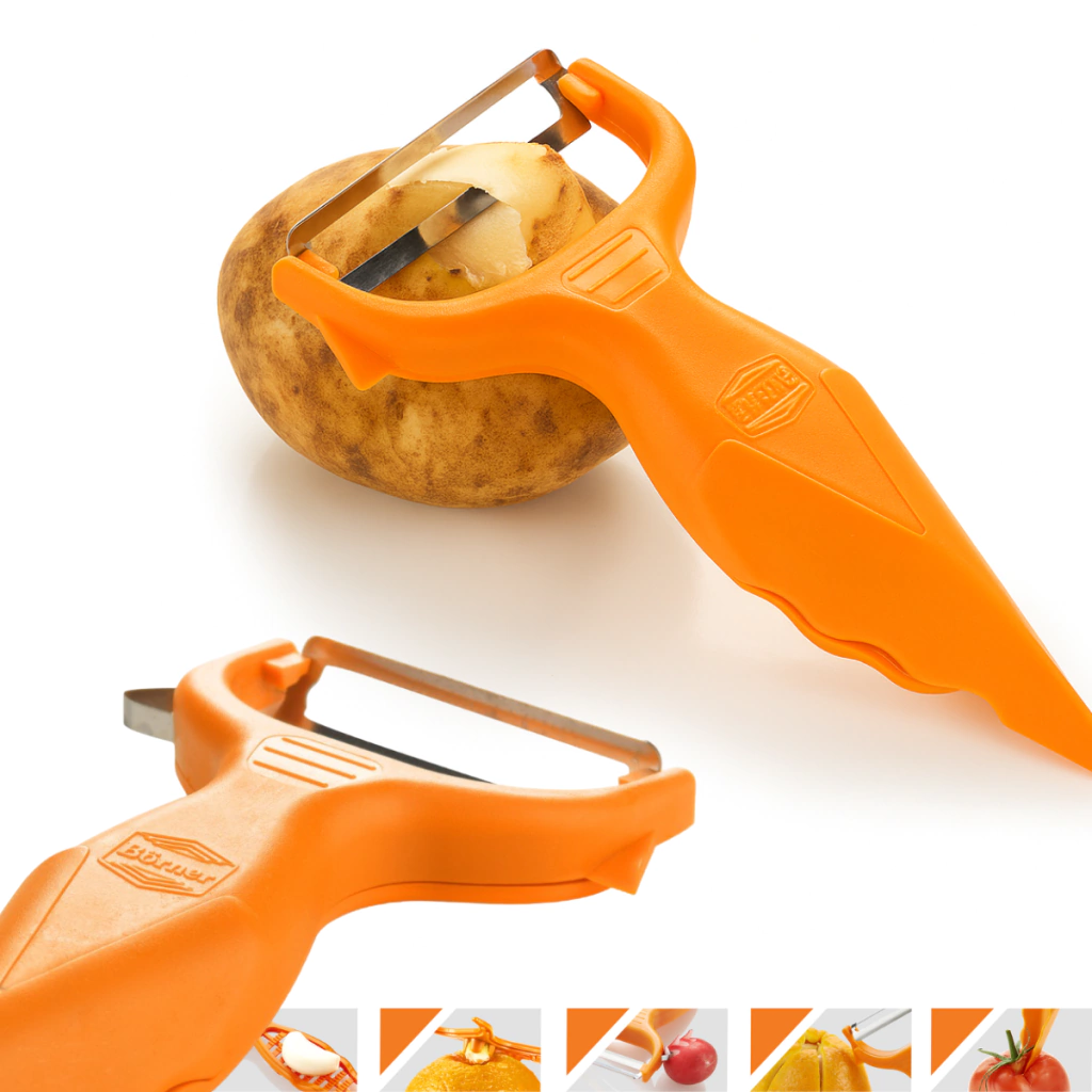 El más completo pelador-decorador del mercado, creado por Börner, con la calidad del acero inoxidable y el PVC irrompible y con 6 funciones en 1: