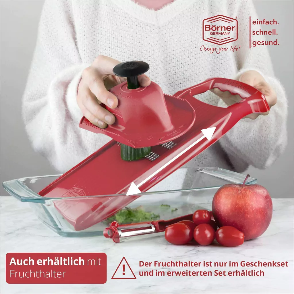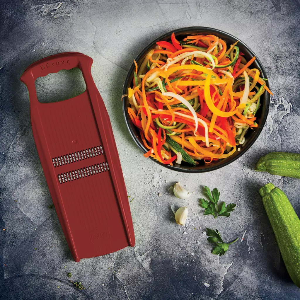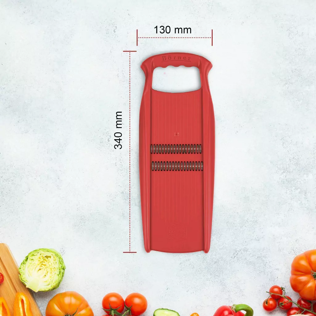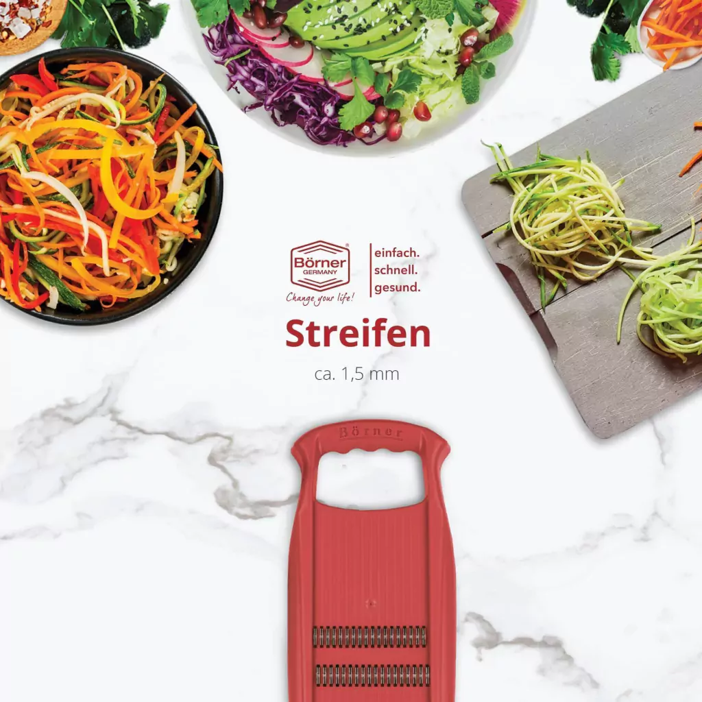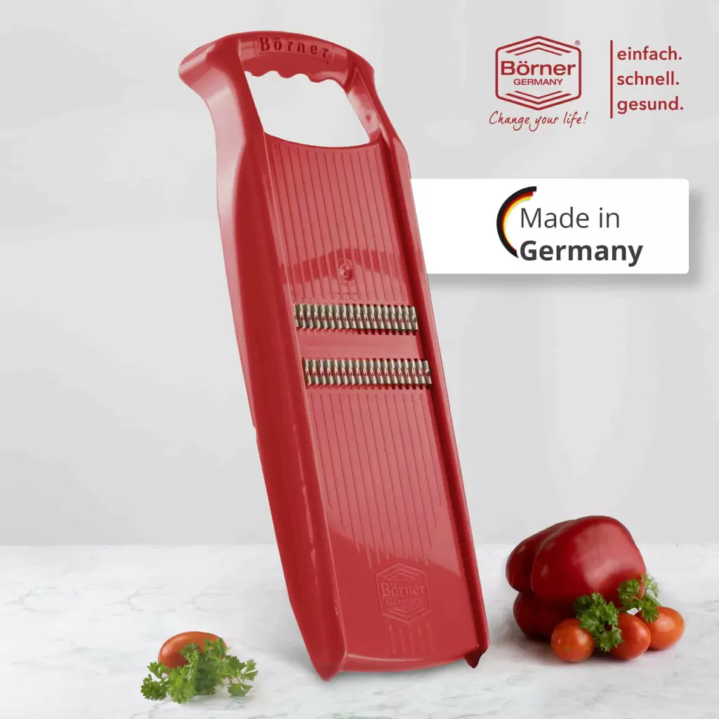 Roko el Hilador vegetariano original de Börner tiene la calidad del acero inoxidable y el PVC irrompible que caracteriza la marca alemana a un excelente precio. Permite realizar hilos fínisimos (imposibles de lograr a mano) consiguiendo una cocción pareja y una atractiva presentación de todos tus platos. Es ideal para cortar cualquier tipo de verduras, logrando cortes largos o cortos de remolachas, papas, pepinos, zanahorias, etc. tanto para ensaladas como para cocinar. Ideal para papas nido.
